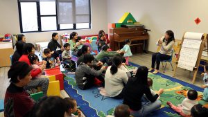 By Serena Yeh Medill Reports Around 20 young children, accompanied by their caregivers, sing and dance to both English and Mandarin nursery rhymes, listen to