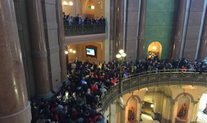 By Morgan Gilbard Gov. Bruce Rauner’s annual budget address to the Legislature was upstaged by approximately 400 protesters who stormed the State Capitol on Wednesday