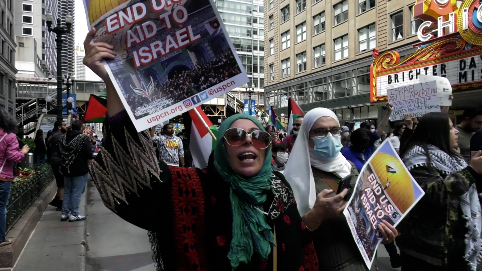Thousands of protesters march through downtown Chicago, calling for an end to the violence between Israel and Palestine.(Cameron Bopp/MEDILL)